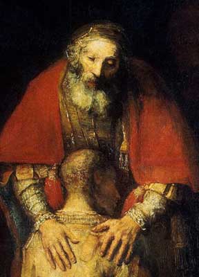 Рисунок вверху: Рембрандт. Возвращение блудного сына (фрагмент). Как живо художник показал умиротворенность на лице отца, вновь обретшего сына. Смотришь на отца, и становится совсем не важной ни изодранная обувь вернувшегося сына, ни его лохмотья, ни остриженная голова раба.